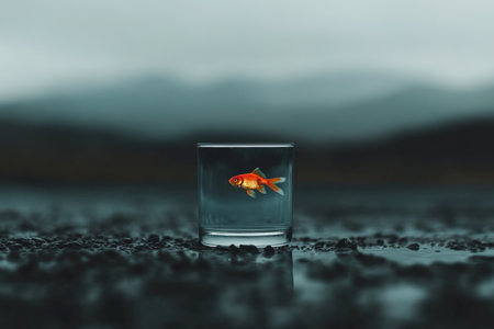 A solitary goldfish glides gracefully in a clear glass, placed on a damp surface, surrounded by a misty atmosphere.