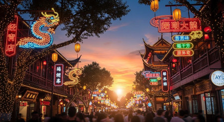 A vibrant street in a Chinese city at sunset with colorful lanterns and dragon decorations