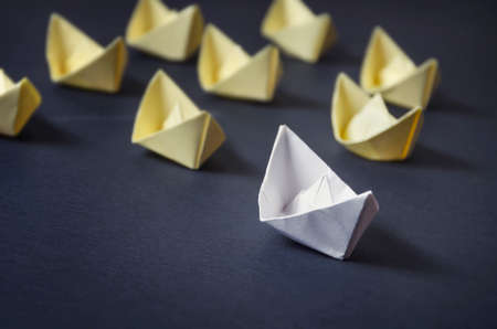 Leadership concept. Group of paper boat on blackboard background. One leader ship leads others