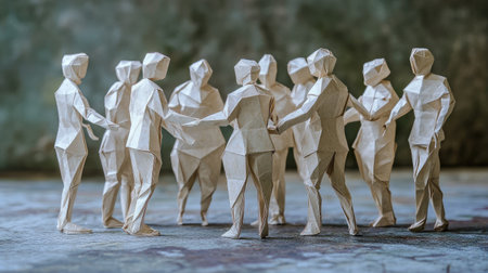 Group of paper people forming a supportive circle, each figure angled slightly forward, engaged in conversation
