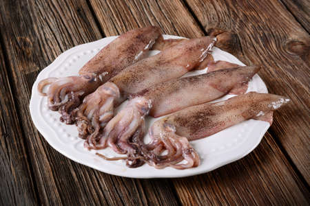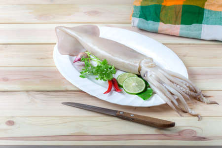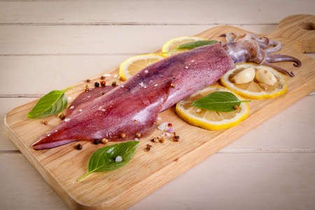 fresh squid on white wooden