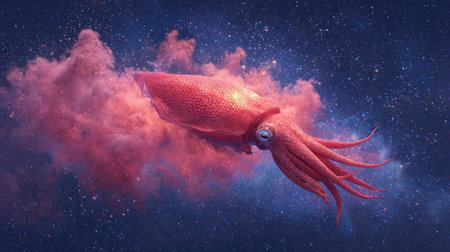 A striking image presents a squid, its form defined by shades of red, contrasted against a dark, cosmic background. A fluffy, pink nebula envelops part of the squid. The artwork is likely digital, with soft lighting and a dreamlike quality. Suitable for artistic projects, science fiction illustrations, or creative content.