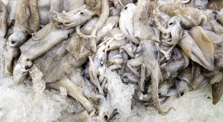 Closeup of a lot of fresh squids with ice on the street market. Bangkok, Thailand