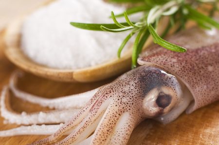 Fresh raw squid with salt and rosemary close up