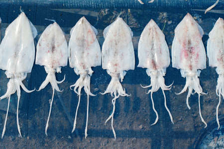 Fresh squid in close up shot. Dead squid that was fishing from the sea.