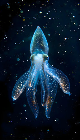 Explore the enchanting beauty of a luminous squid as it glides effortlessly through an ethereal underwater realm, showcasing vibrant colors and graceful motion.