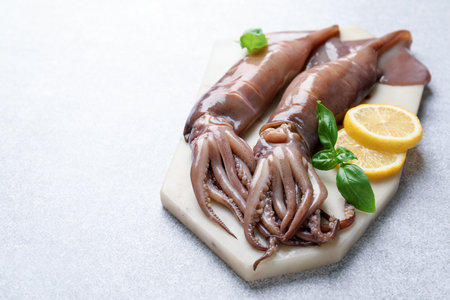 Raw squids, lemon and basil on light gray table, closeup. Space for text