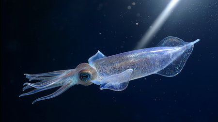 A translucent squid swims effortlessly in the deep ocean, illuminated by a single beam of light