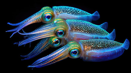This stunning image captures a group of vibrant squid swimming gracefully through dark waters, showcasing their unique bioluminescent patterns and vivid colors.