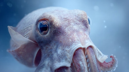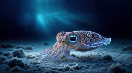 A bobtail squid genus Rossia resting on the ocean floor in a deep-sea environment, surrounded by soft blue light and fine sediment, showcasing its compact body, intricate patterns, and natural habitat.