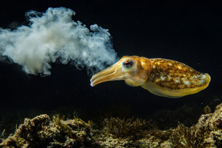 A golden-speckled cuttlefish releases a cloud of ink into dark waters, showing its defense mechanism against a backdrop of marine vegetation.