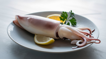 A white plate with a squid and lemon on it, AI
