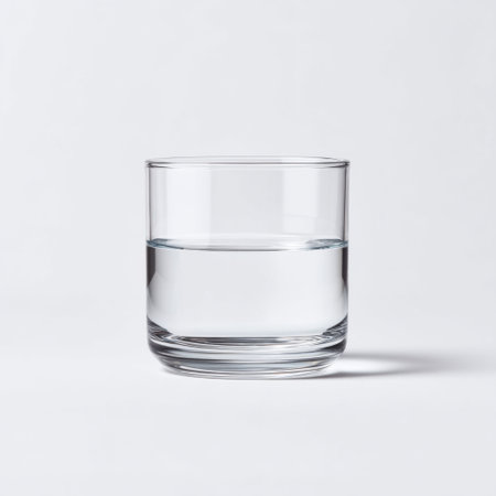A clear glass filled with water sits elegantly against a minimalist background, capturing the essence of purity and simplicity. The reflective surface enhances the calming atmosphere, ideal for showcasing freshness and hydration in various contexts.