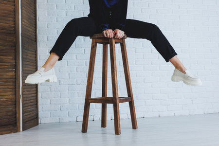 Legs of a young beautiful woman in black trousers and modern stylish white leather loafers. New collection of women's shoes spring-summer 2022