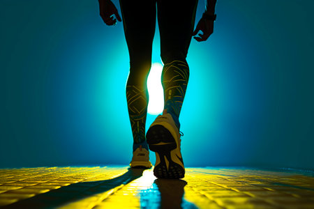 Pair of sneakers worn by athlete standing on track, preparing for athletic competition, symbolizing focus, energy, and physical effort.