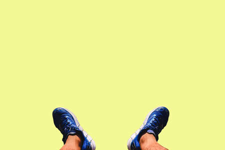 Close-up of a pair of colorful sneakers and denim legs against a bright, pastel-colored wall, with copy space for text.