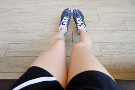 Running Shoes for Jogging. Selfie Woman in Violet Sneakers (Sport) on Wooden Floor Background Great For Any Use.