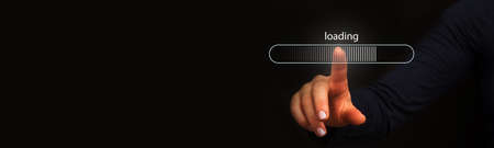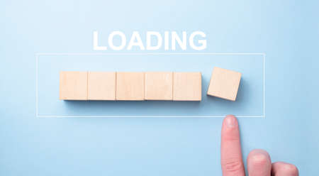 Hand putting wooden cube on virtual infographic rectangle block with loading wording. Job and electronic download progressive concept.