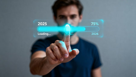 Man pointing at a glowing holographic progress bar showing 2025 Loading... 75% with futuristic design elements, symbolizing technology, progress, and innovation.
