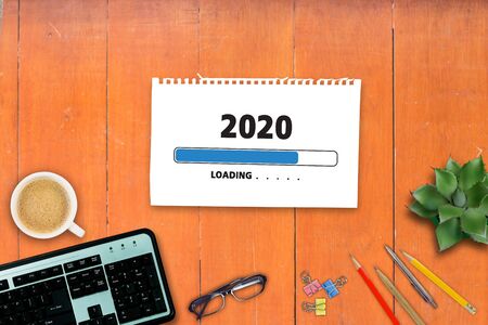 Office table with notepad writing text 2020 Loading. Concept meaning Advertising the upcoming year Forecasting the future event Thick pages notebook stationary placed above classic look wooden backdrop.