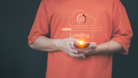 Adult man holding a smartphone with a glowing orange cloud upload icon and loading progress bar, representing cloud computing, data transfer, internet of things, and digital technology.