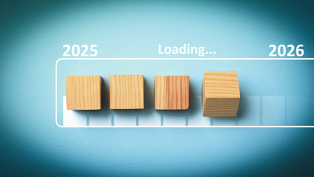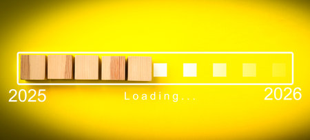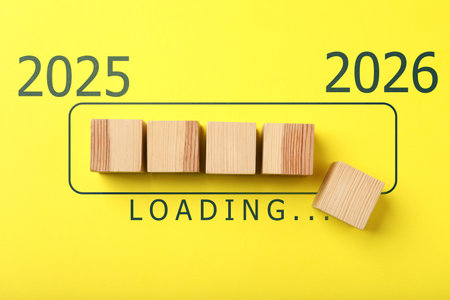 New Year 2026. Wooden cubes in loading bar on yellow background, top view