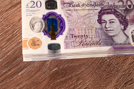 British twenty pounds sterling banknotes closeup. Portrait of Queen Elizabeth II.