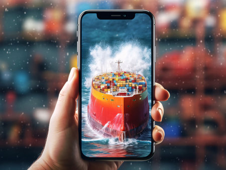 Smartphone screen: Hand holding smartphone with image of cargo ship in port. Logistics and transportation concept.
