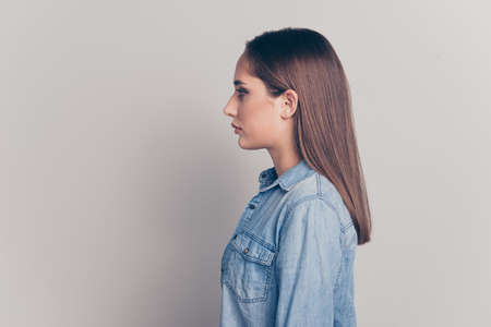 Profile side view photo of charming attractive hipster lady youth feel glad calm relax rest ponder focused ready work concept dressed fashionable youngster outfit isolated grey background.
