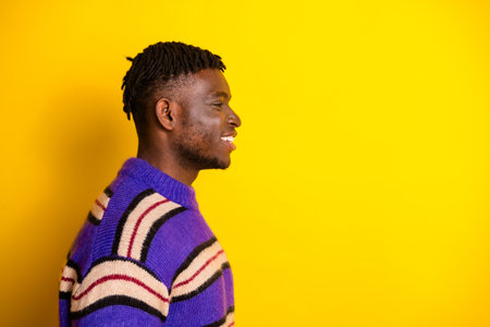 Profile portrait of nice young man empty space ad wear sweater isolated on yellow color background