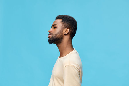 Profile portrait of a young Black man with a thoughtful expression against a bright blue background, showcasing modern casual fashion and seasonal style