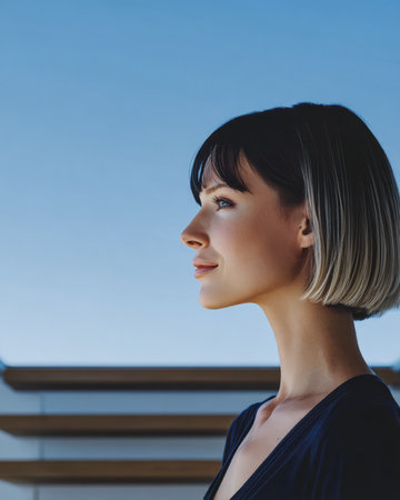 Profile portrait serious assertive blond lady in knitted sweater looking far away, elegant unsmiling woman. Indoor studio shot isolated on blue background