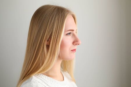 Portrait of lovely blonde young woman sitting sideways and looking away. Light-haired lady with natural makeup posing indoors. Professional model and beauty concept