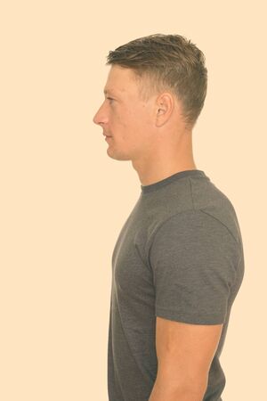 Handsome and unshaven. Young man in profile. Profile portrait of caucasian guy