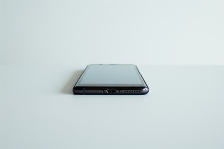 Modern white smart phone is lying on a grey surface or table, perspective view