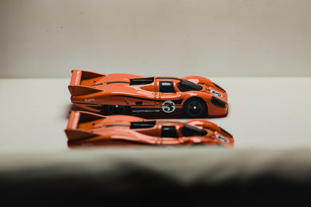 Mantua, Italy - 28TH DECEMBER 2025 - Hot Wheels replicas of two Porsche 917C in orange race livery pretending to have a race on a race track