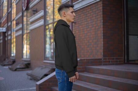 Mockup of a black hoodie on a young guy in blue jeans, side view. Template of casual wear for presentation of design and pattern. Empty hood with sleeves for advertising in the online store