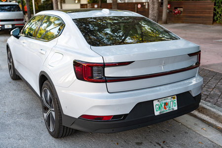 Miami, Florida, USA - July 27, 2025: Polestar 2 2023 electric vehicle. Electric car Polestar 2. Car Polestar 2 parked outdoor. White electric car, corner view