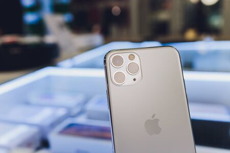 Ufa, Russia, 24 September, 2019: The iPhone 11, 11 Pro and Pro Max are displayed as the smartphone by Apple Computers goes on sale rear view of triple-camera.