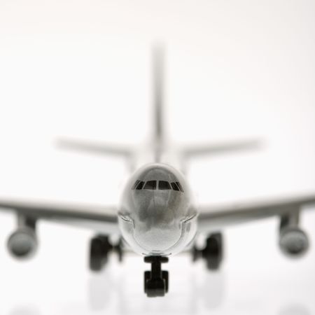 3d airplane isolated on blue background. front view, jet commercial airplane, plane travel concept, 3d render illustration