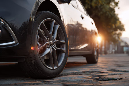 Tire and alloy wheel of a modern car on the ground, car exterior details