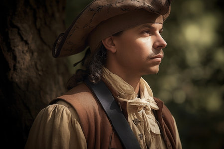 Rugged man with intense gaze wears a tricorn hat and dark cloak, evoking a historical or pirate theme. His weathered face shows determination and resilience in a dramatic close-up
