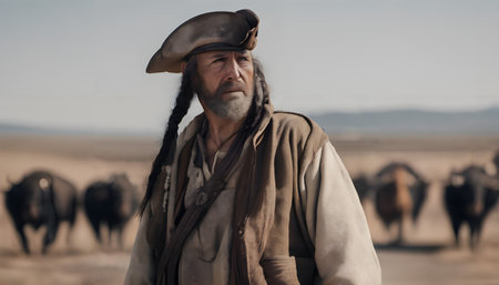 An older man with a rugged appearance, dressed in historical frontier attire, including a tricorn hat and long braided hair, stands in a vast open plain with a herd of bison in the background. His expression is stern and contemplative, reflecting the harsh and wild environment of the American frontier.