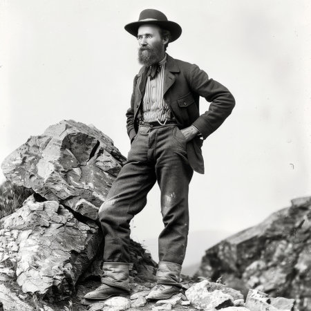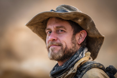 Bearded man in wide-brimmed hat and scarf, gazing confidently sideways. His dusty attire and weathered expression suggest outdoor adventure or exploration in rugged environments