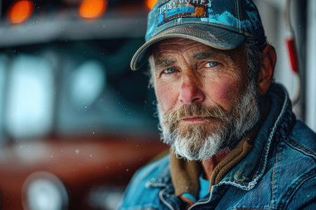 Close-up of an experienced truck driver, his face telling tales of the long road.