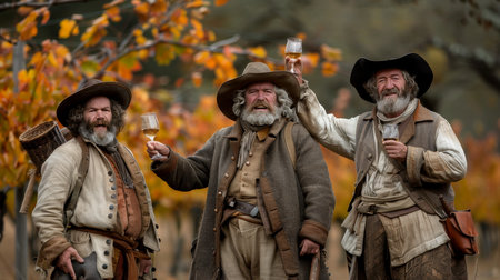 Peasants celebrating successful harvest, raising wine glasses in joy amidst grapevines