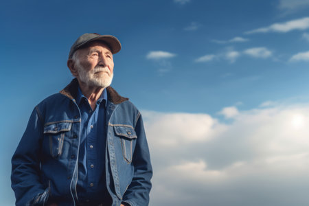 Old man with a long white beard in a hat and a blue jacket on the seashore. generated by AI.