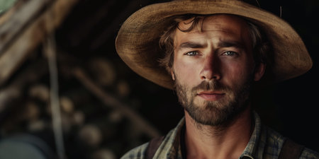 Portrait of handsome bearded man with serious face ond cowboy hat outdoor. Close up masculine face.