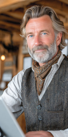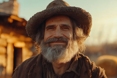A man with a warm smile and a gray beard stands outside in a rustic setting. He wears a weathered hat and enjoys the soft golden light of sunset, evoking a sense of contentment and tranquility.