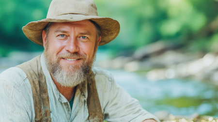 Smiling bearded man outdoors by the river in casual attire and hat, enjoying nature's tranquility.